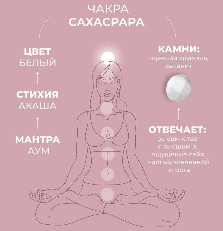 7 чакра "Сахасрара" (коронная чакра) - отвечает за осознанность, духовность, связь с высшими силами.